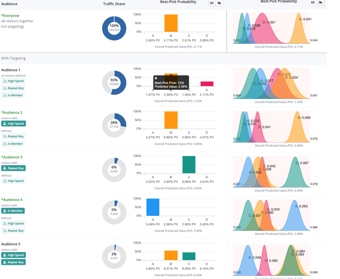 It can also be useful to see the contextual bandit as a set of mutually exclusive rules where the teams can see the size, the conditional probabilities of each option to have the highest value, as well as a visual of the estimated underlying conditional posterior distributions that give rise to those conditional probabilities.