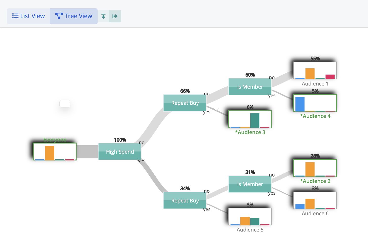 To help facilitate interpretability, Conductrics represents its learning and contextual bandit models in a tree structure that makes it very easy for teams to be able to parse the learning/bandit logic in order to see both which segment data was selected and to give a quick scan of which options each audience prefers.